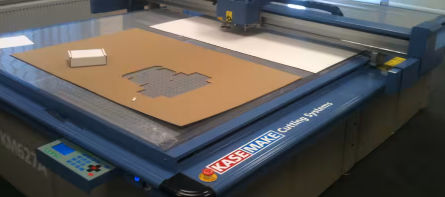 With a view to improve its sample making service for trade clients still further, Board24 have invested in AG/CAD’s sample making table and supporting KASEMAKE software. Board24’s Managing Director Richard McBride reflects: “Our high volume trade case making service has grown steadily and continues to augment and complement our core sheet feeding business. Whilst our existing arrangements for sample making have worked very well for all concerned during our initial growth phase, the number of samples required has hit a critical mass and the benefits of having our own sample making capability have become clear.”