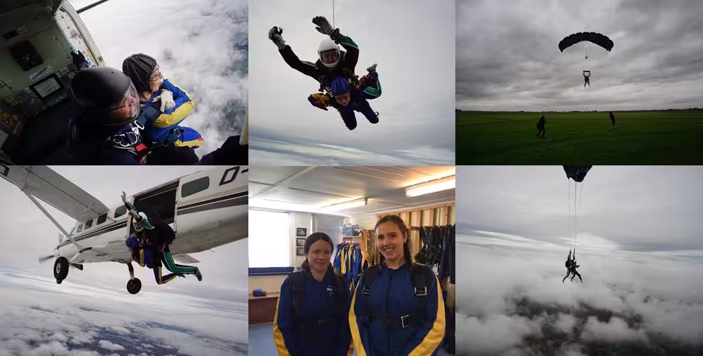 The pair took part in the tandem skydive on 4th October in Nottingham. After a nerve-racking journey to the required altitude in their stylish new outfits, Beth drew the short straw and had to jump first and Jemma followed soon after. They were freefalling through the sky at 120mph until their instructor deployed the parachute, given a once in a lifetime opportunity to steer and spin. After ‘graceful’ landings, they reconvened back on the ground, and thanked their lucky stars that they had survived the 13500ft drop wanting to go straight back up see that amazing view once again!